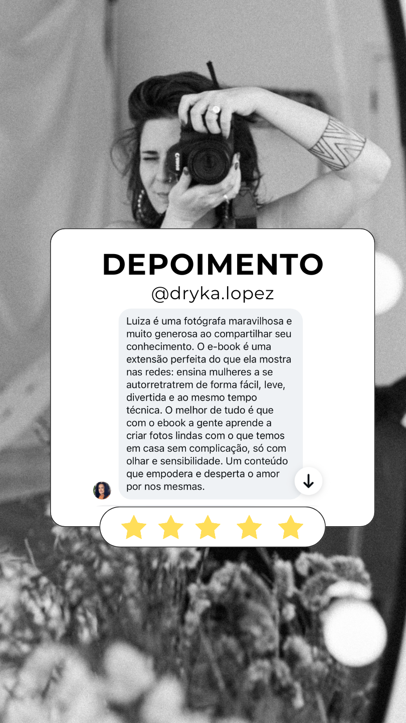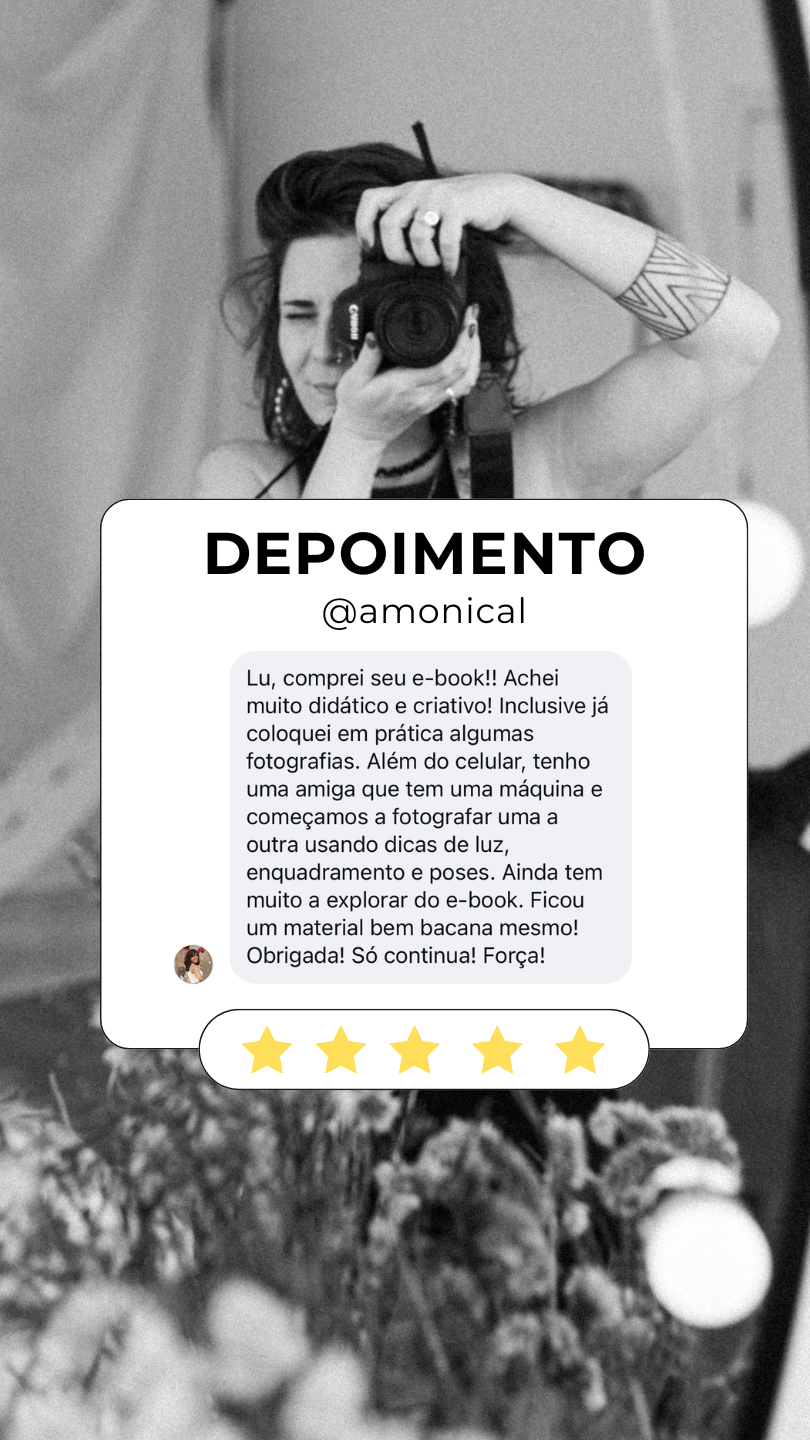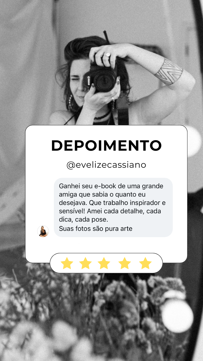 Um e-book prático e simples para aprender a tirar fotos lindas suas, posar com confiança e, você vai aprender com uma fotógrafa de mulheres, usando apenas o celular para você parar de dizer que não é fotogênica e começar a arrasar nas suas fotos!
